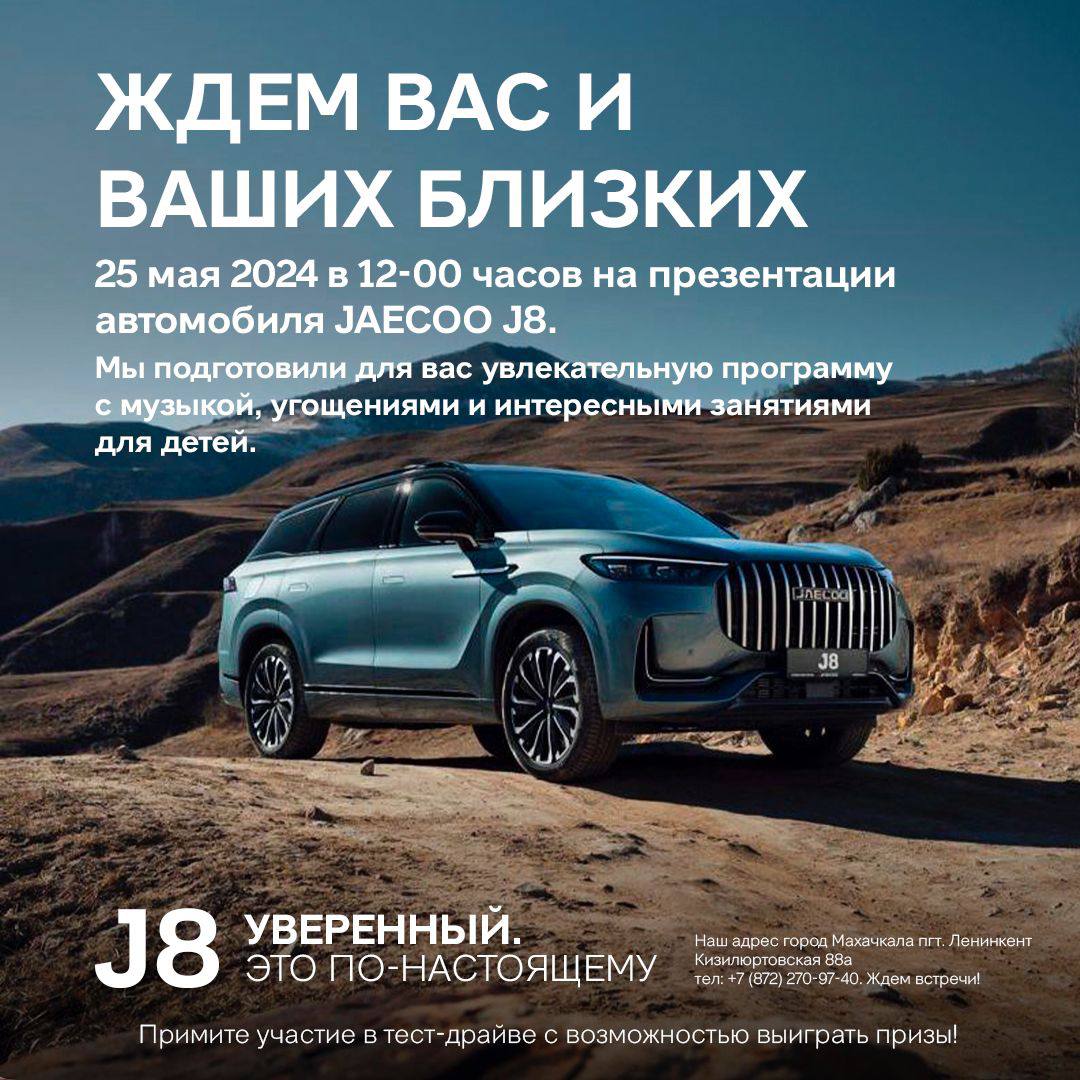 Добрый день! Ждем вас и ваших близких 25 мая 2024 в 12-00 часов на презентации автомобиля JAECOO J8. Мы подготовили для вас увлекательную программу с музыкой, угощениями и интересными занятиями для детей. Примите участие в тест-драйве с возможностью выиграть призы!